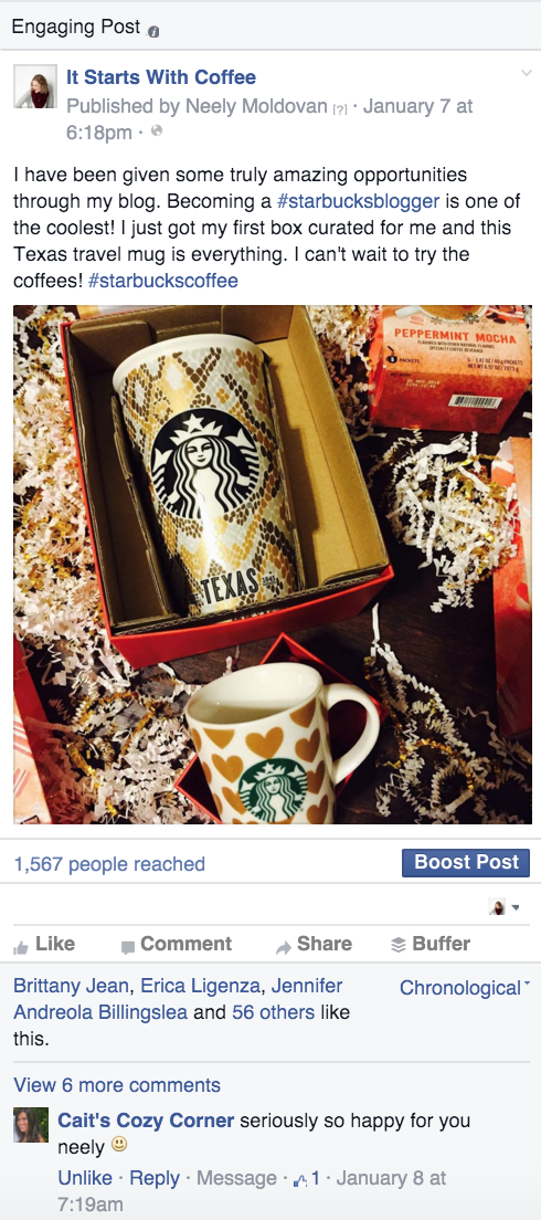 This is an Instagram post I posted on January 7th at 6:18 PM. This is not the usual time I post Instagram photos, but when I posted it I immediately saw a ton of interaction onto my Facebook page. This is without any boosts, just purely organic.